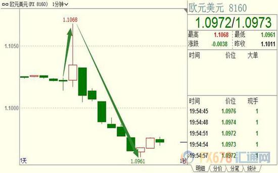 北京时间周四(9月12日)19:45,欧洲央行宣布降息10个基点,该预期已经为市场所消化,欧元兑美元一度上冲逾45点至1.1068。但欧银同时宣布重启QE,于11月1日起,重启资产购买计划,规模为每月200亿欧元。并将开始实施利率分级制度,汇价迅速转跌。截至发稿,欧元兑美元跌近65点至1.0961,短线波动达到近110点。