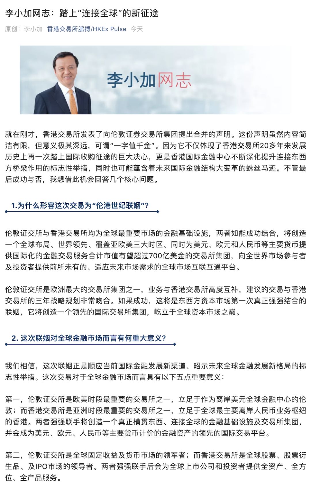 港交所行政总裁李小加当日发表题为《踏上“连接全球”的新征途》的文章称,该收购是一千载难逢的“伦港世纪联姻”。表示两者如能成功结合,将创造一个全球布局、世界领先、覆盖亚欧美三大时区、同时为美元、欧元和人民币等主要货币提供国际化的金融交易服务合计市值有望超过700亿美金的交易所集团。