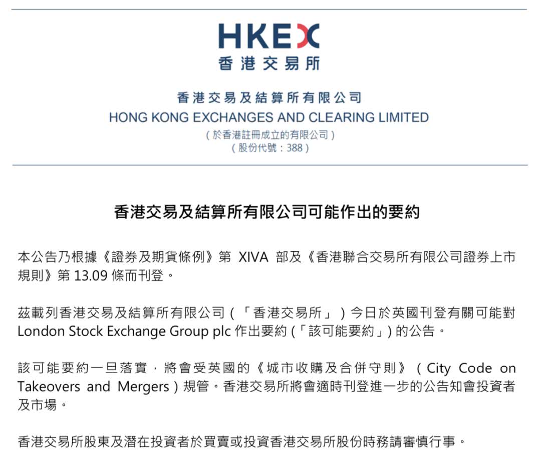 香港交易所11日发布公告称,拟以总价316亿英磅并购伦敦证券交易所。