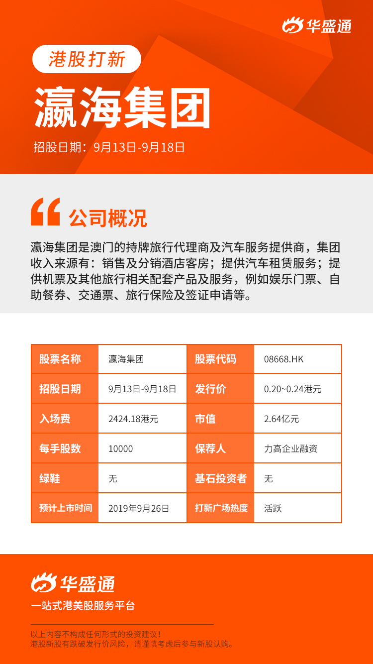 公司于2019年9月13日至9月18日招股,拟发售股份数目3亿股股份,股份发售包括公开发售初步提呈3000万股公开发售股份(可予重新分配)以供认购,相当于股份发售项下可供认购的发售股份总数10%,以及配售初步提呈2.7亿股配售股份(可予重新分配)以供认购,相当于股份发售项下的发售股份总数90%。发售价将不高于每股发售股份0.24港元并预期不低于每股发售股份0.20港元。