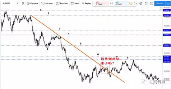 那些拥有足够耐心的交易者则非常钟意趋势交易,他们会选择更长的时间轴,并追随趋势一直交易下去。请看下图,同样的澳元/美元周线图,大多数交易者会据此画出如图所示的橙色趋势线。同时在价格突破后,做出看多的决定。