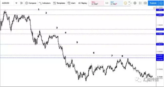 上图的澳元/美元周图都显示出稳定的下跌趋势。在过去的7年里,这一货币对一直整体呈跌势。如果使用较短时间轴,可能会产生更多干扰我们判断趋势的不利因素。因此,在使用周图作为分析趋势的基本之后,我们只需注意Lower Lows和Lower Highs的依次出现,便能很好地判断趋势。