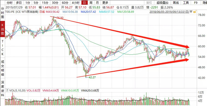 而从目前原油的价格来看,以WTI原油的价格走势为例,自2018年10月至今,其价格历经涨跌后,目前呈现出波动收窄的状态,正面临重要的方向性选择。
