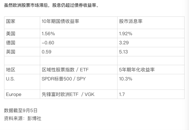 欧洲股市牛市的部分原因在于,鉴于欧洲的国债收益率处于低位或负值,比如德国10年期国债收益率为-0.6%,对收益率十分饥渴的欧洲投资者将会转向股市。