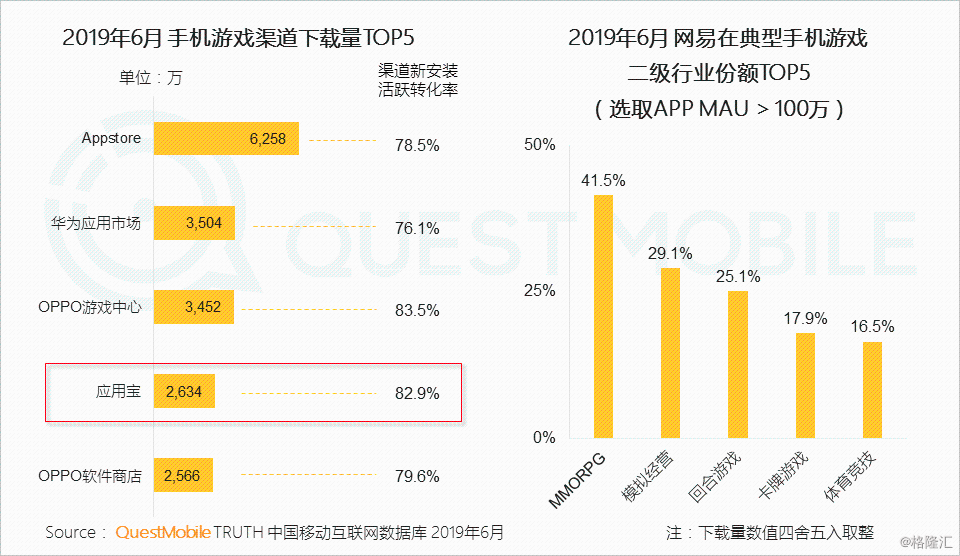 虽然好消息已经到来,但是压力仍旧促使行业做出改变:用户月均时长相比高点已经下降了1个小时,流量玩法失效,精品化不可逆转,这也导致头部企业获益,行业老大老二已经占据了近6成用户,腾讯以IP+渠道分发(应用宝是Top 5分发渠道,也是唯一非终端厂商),网易以细分+研发,各自安好。
