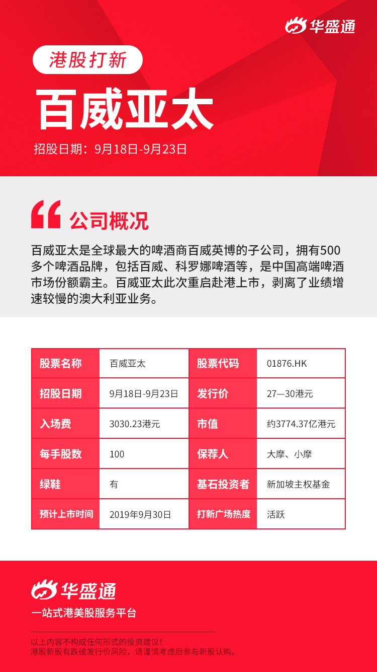 百威亚太(01876)9月18日-9月23日招股,公司发行12.6亿股,其中95%为国际发售,5%为公开发售,另有最多15%超额配股权。每股发行价27港元-30港元(单位下同);每手100股,预期9月30日上市。