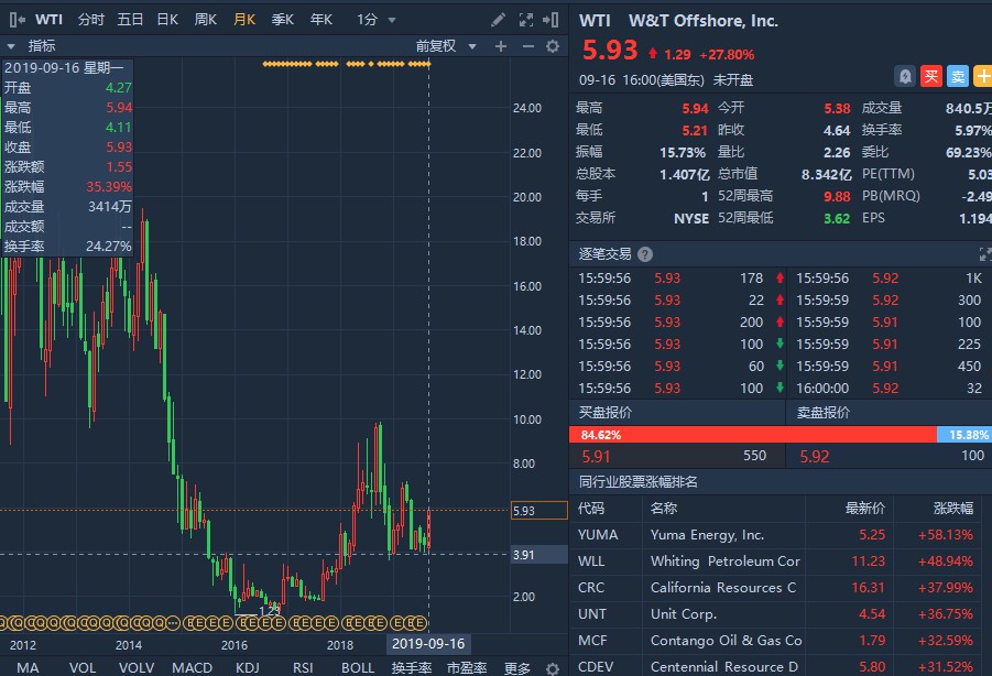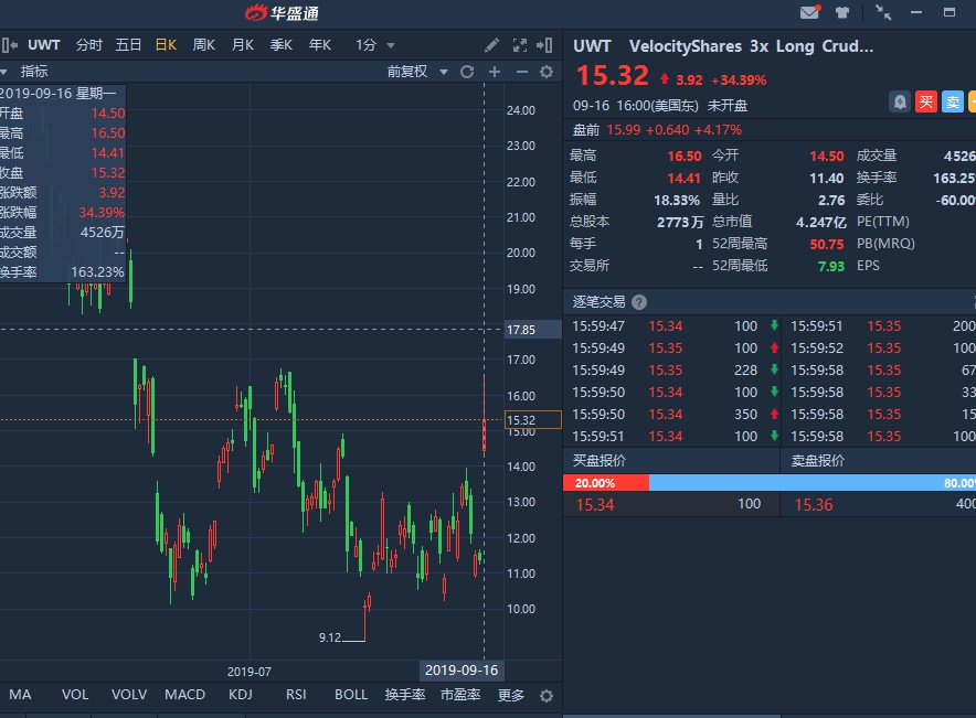 美股ETF三倍原油做多,代码UWT,一夜间暴涨34.39%。
