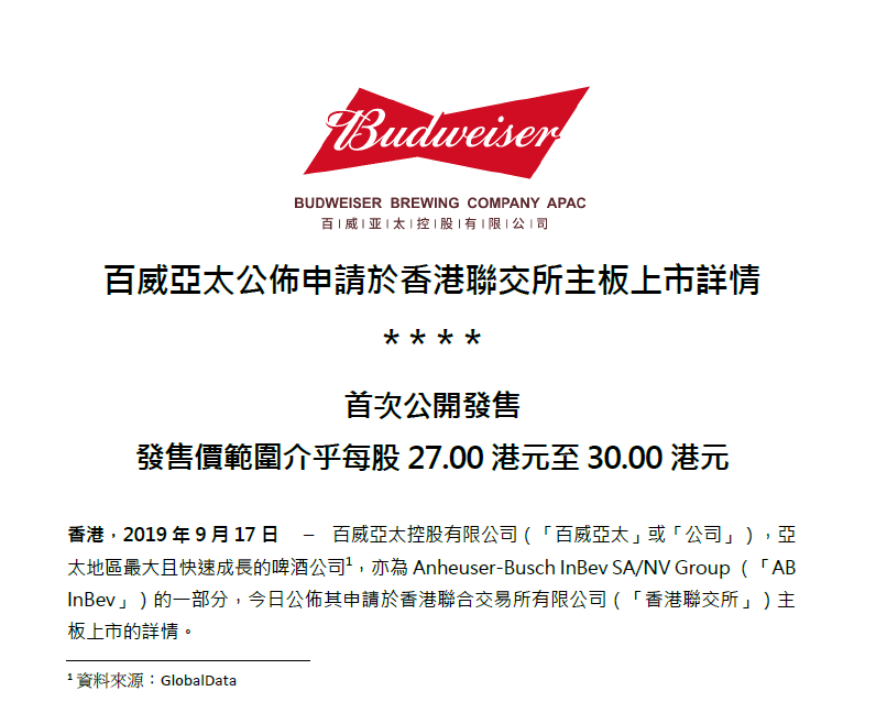 新京报讯(记者 王子扬)9月17日,国际啤酒巨头百威英博亚太子公司百威亚太发布公告称,计划以每股27港元—30港元的价格发行约12.62亿股股票。百威亚太预计9月18日开始路演,9月23日敲定IPO价格,并于9月30日正式上市,股份代号为1876(BUD APAC)。
