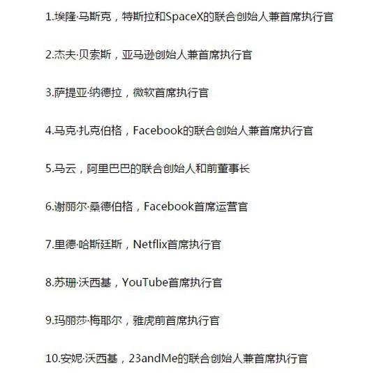 在这份榜单上马斯克排名第一,尽管他的古怪行为引发了不少争议之声。紧随其后的是亚马逊创始人兼CEO杰夫-贝索斯。微软CEO萨提亚-纳德拉与Facebook创始人马克-扎克伯格分列第3、4位。
