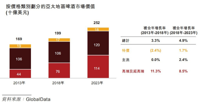 据Global Data预测,预计2018年至2023年,亚太地区高端及超高端啤酒市场价值将以8.4%的复合年增长率增长至1140亿美元,高端及超高端啤酒占市场价值比重将进一步提升至45.24%。