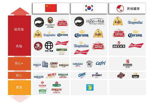 百威亚太盈利能力数倍于竞争对手的根源在于其高端市场的霸主地位。截至2018年末,百威亚太旗下拥有50个啤酒品牌(包括自百威集团获得许可的品牌),其中有近6成为高端及超高端品牌,这些品牌也成为百威抢占市场的利器。