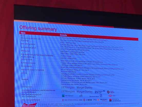 百威亚太这次计划以每股27-30港元的价格发行约12.6亿股股票。路演9月18日开始,定价日期会在9月23日,上市日期定在9月30日。基石投资者 GIC 投资大约10亿美金左右。其中国际发售占比95%,公开发售占比5%。