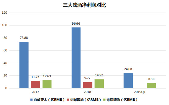 如果说百威与华润和青岛的营收差距还不够大,那么净利润差距就非常大了。从2018年的数据来看,百威亚太实现净利润96.66亿元,同比增长超30%。相比华润啤酒的9.77亿,百威亚太是它的9.89倍;相较于青岛啤酒,则百威是其6.8倍。