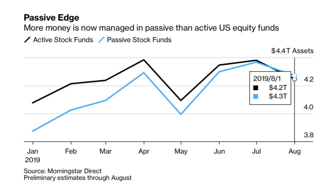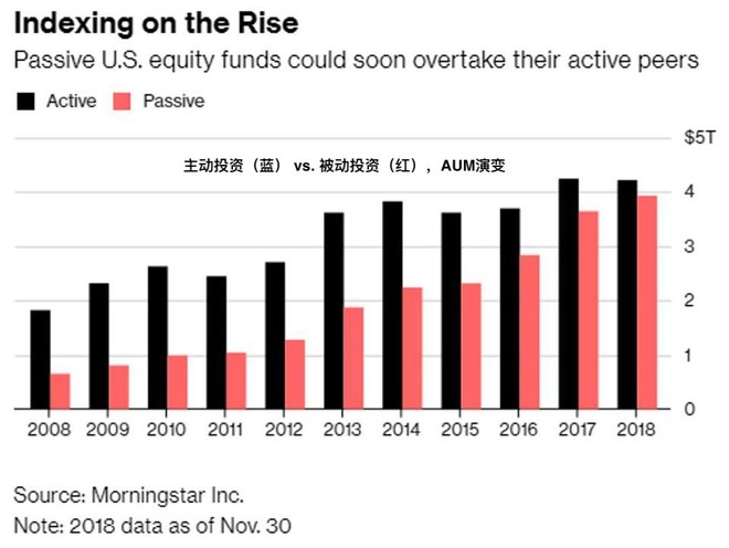 指数投资与ETF都不新,先锋基金的伯格大佬刚开始吹指数投资的时候是七十年代;但ETF与指数投资崛起成为一种“大规模”的金融现象,无非是近几年而已。刚刚过去的八月美股市场就创造了历史,被动投资的股票基金的AUM(管理资产)——包括共同基金和ETF——已超过主动基金的AUM。眼下被动型基金目前是4.27万亿美元规模,而主动型是4.25万亿。这是人类史上头一次。