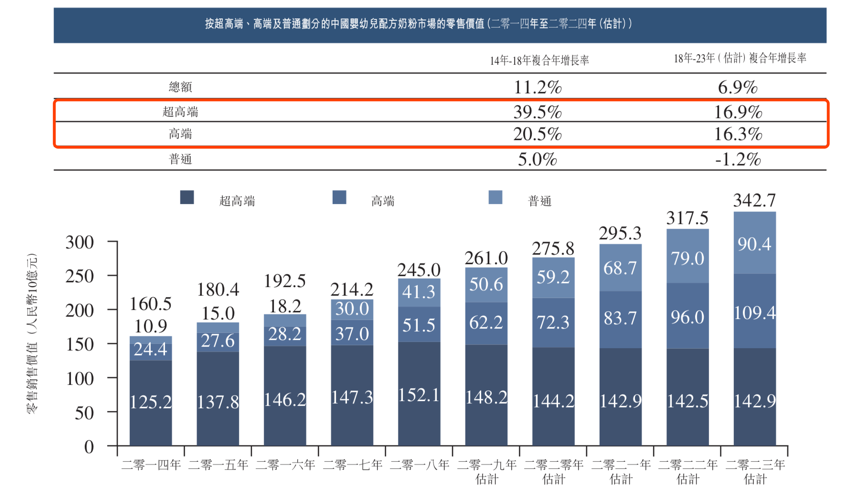 中国婴幼儿配方奶粉市场趋向结构性增长,高端及超高端产品增长空间广阔。根据此前飞鹤奶粉招股书的数据,2014-2018年间,按零售价值计量,中国婴幼儿配方奶粉市场年复合增长率为11.2%,其中高端及超高端产品年复合增长率分别为39.5%、20.5%,显著高于普通配方奶粉增速。此外,弗若斯特预测未来5年的婴幼儿配方奶粉市场仍将以高端及超高端市场的发力为主,普通(低端)婴幼儿配方奶粉市场将陷入负增长。
