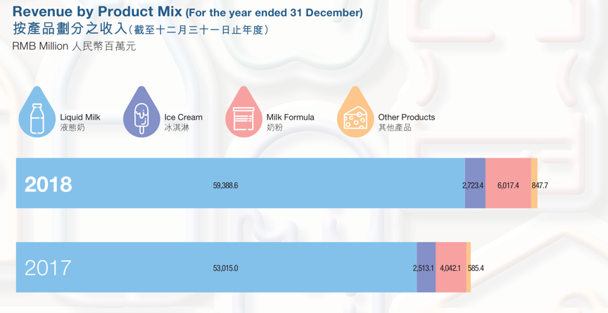 首先在业务分部上,奶粉业务只是冰山一角,真正的核心业务还是液态奶分部。2018财年,蒙牛乳业于报告期内录得营业收入689.77亿元,其中液态奶分部营收为593.88亿元,占总营收比重86.09%,而奶粉业务占比仅8.72%。
