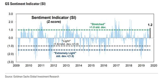 据Marketwatch援引高盛的一份最新研报指出,随着经济衰退的担忧消退以及签署贸易协议的期望回升,投资者对美股的投资兴趣明显增加,目前美股仓位已达到2019年的最高水平。