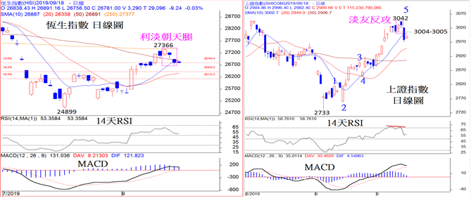 前日的分析指出:「恆指的升勢不單只升抵『鑽石』形量度目標後逆轉,更受到『綠星日』的轉向效應影響而「準時」在9月13日見頂回落。目前的重要支持水平集中在26945-26955,當中包括29008至24899跌幅的0.5倍反彈目標26954(由阻力轉化為支持)及50天平均線。」