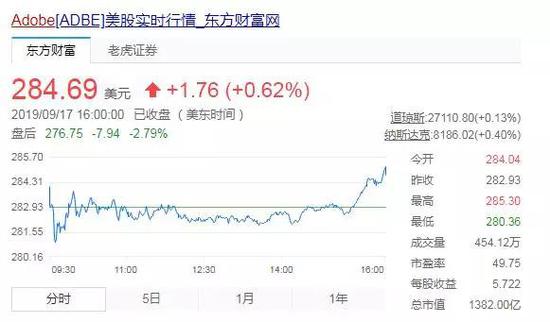 Adobe股价周二在纳斯达克交易所上涨1.76美元,收报284.69美元,涨幅为0.62%。在财报发布后的盘后交易中,受业绩预期不及市场预期的影响,截止文章发稿,Adobe股价跌幅超2.79%,盘后股价为276.75美元,市值为1382.00亿美元。