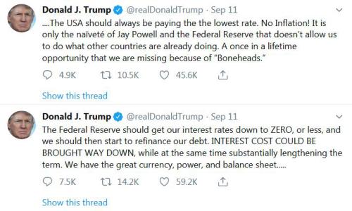 值得一提的是,当地时间9月11日,美国总统特朗普发表推特称:“美联储应该让我们的利率降到零,或者更低,然后应该开始为我们的债务再融资。利息成本可以大幅降低,同时大幅延长期限。我们拥有强大的货币、实力和资产负债表。美国应该一直支付最低利率。没有通胀!”他还称:“因为鲍威尔和美联储的幼稚,才不允许我们做其他国家已经在做的事情。”