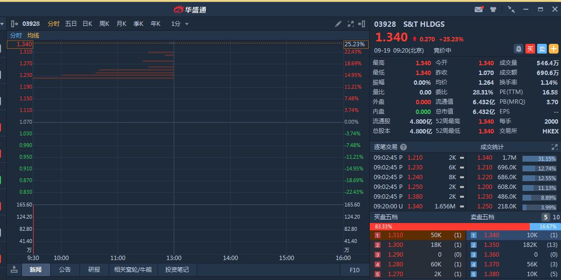 格隆汇9月19日丨IPO那点事:S&T HLDGS(03928.HK)首日挂牌,截至9时20分,涨25.23%,报价1.34港元 ,成交额690.69万港元 ,最新市值6.432亿港元。