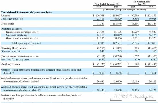 招股书显示,Datadog在2019年上半年营收1.5亿美元,上年同期为8539万美元;Datadog在2017年、2018年营收分别为1亿美元、1.98亿美元。