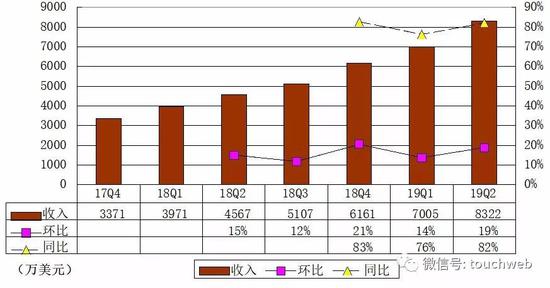 Datadog在2019年第二季度营收为8322万美元,较上一季度的7005万美元增长19%,较上年同期的4567万美元增长82%。