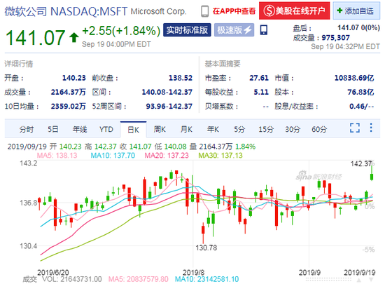 新浪美股讯 北京时间20日消息,截至周四美股收盘,美国科技行业巨头微软公司上涨1.84%,报141.07美元,盘中股价创历史新高142.37美元。目前,微软总市值升至10838.69亿美元,继续占据市值第一大上市公司位置。