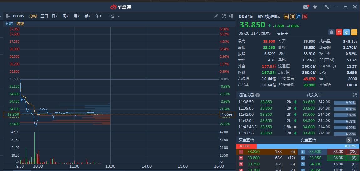 被誉为“港股小茅台”的维他奶延续前几日跌势,今日开盘走低。截至发稿,维他奶现跌4.65%,报33.85港元,最新市值360亿港元,动态市盈率依旧高达51倍。