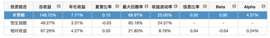 笔者的具体参数是购买PEG小于0.8的股票,调仓周期设置为1000天,最大持仓股票数为10只,回测的时间区间为2007-2019年。回测的结果是PEG策略在13年间的收益为149.72%,而恒生指数期间涨幅仅49.27%,PEG策略大幅跑赢恒生指数,期间年复合回报率为7.71%。
