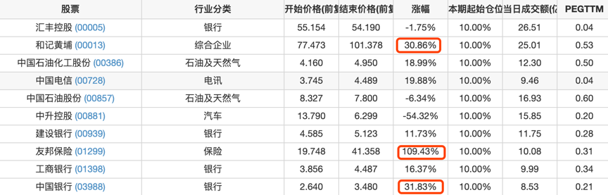 再看看期间所选择的股票。在2011-2019区间中,选择的股票PEG策略包含中国平安、友邦保险、汇丰控股、和记黄埔等涨幅翻倍的超级成长股。