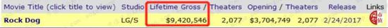 然而,《摇滚藏獒》遭《大鱼海棠》撞档,国内总票房仅为3954万元,扑得一塌糊涂。《大鱼海棠》5.65亿元的国内总票房远远地把《摇滚藏獒》甩在了身后。