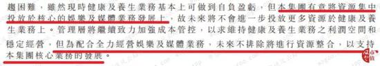 根据最新半年报披露,华谊腾讯娱乐不排除以后将进一步削弱甚至剥离健康及养生服务业务以反哺核心娱乐及媒体业务。