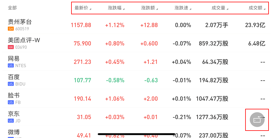 位置④:横屏展示自选股信息。点击“小图标”,位置⑥的股票将横屏展示,在横屏情况下,我们可以看到股票的最新价、涨跌幅、涨跌额、涨跌速等等维度的信息,并且可以点击这些维度指标进行排序查看。