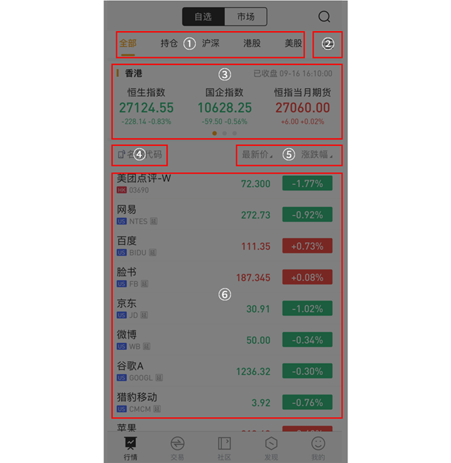 位置①:快速切换不同市场分组,下方会自动匹配显示出不同分组的股票。比如我们选择了“美股”,则位置③会自动显示与美股相关的重要指数情况,以及位置⑥会显示我们自选股中是美股的股票。