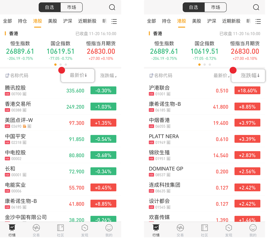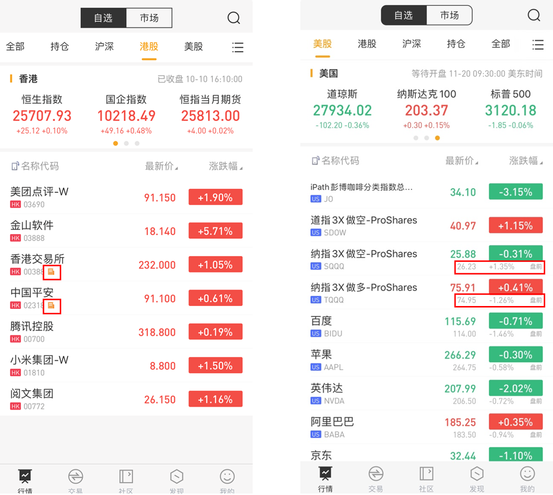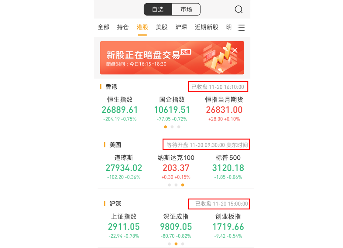 位置③:香港、沪深、美国三个交易市场的主要大盘指数,左右滑动,即可切换不同市场了解大盘情况,并且每一个模块下还会有市场交易时间提醒,会出现交易中、已收盘、盘前盘后等信息。