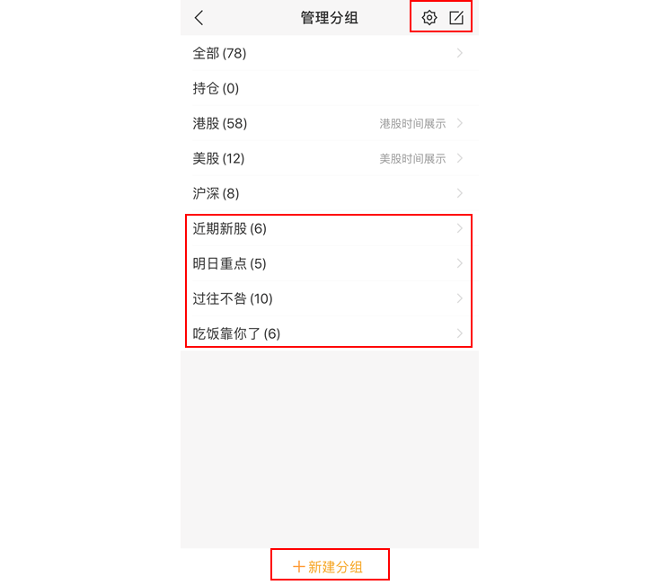 位置②:设置“行情-自选”页面显示的分组,点击进去后,我们可以按照我们自己的偏好调整分组的顺序,也可以根据自己偏好创建不同的股票分组,这样就可以在“行情-自选”页快速切换不同的分组,查看股票了。