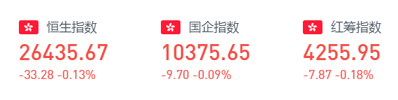 全天震荡下跌。截至收盘,恒生指数跌0.13%,全日成交额达943.84亿。国企指数跌0.09%,红筹指数跌0.18%。