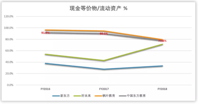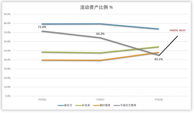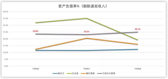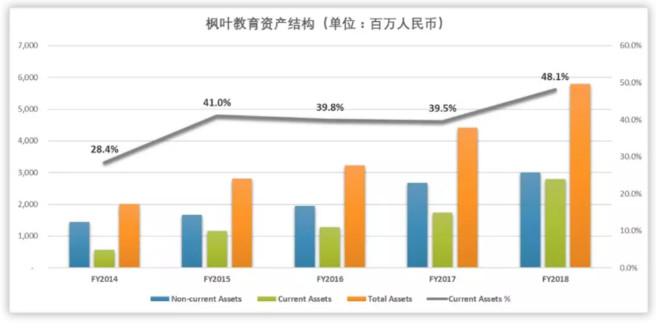 相反,枫叶教育因为早年采用重资产自有校园的模式扩张,即使公司2012年后转型轻资产的扩张模式,但如果好未来、新东方剔除掉【投资性资产】的因素,枫叶教育的资产结构在这四家中仍旧最重。