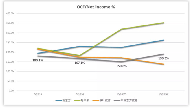 其次,东方教育的盈利跟同业其他玩家一致,都是真金白银,经营性现金流占净盈利比例过往数年都超过150%,整体看几乎不存在赊账、欠款。原因非常简单,就是前面提到教育行业「先收费、再服务」的先天优势。