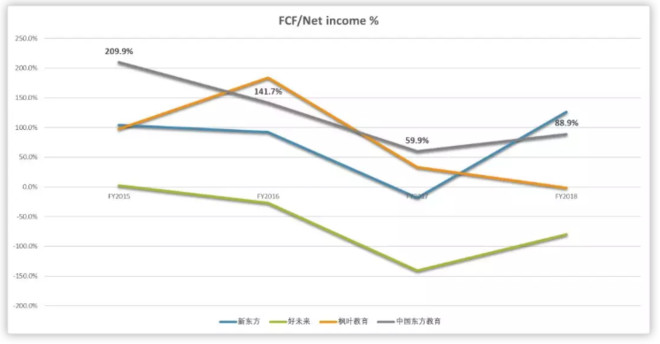 而且,自由现金流占净盈利比例层面,东方教育同样表现优异,一直在同业中维持相对高位。即使公司2017年因为大幅扩张的因素,该年指标都能够维持近60%。简单讲,公司绝大部分盈利在理论上都可以派发给股东,不需要过大的资本开支就可以维持业务经营。
