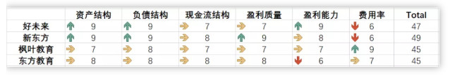 因此,结论是,4家教育集团各有千秋,东方教育的商业模式介于高教和K12培训机构之间。如果按照上述各项指标单独打分并汇总,每项最高给10分(总分60分),分数越高表示该项表现越优秀,可以明显看到,东方教育主要因为【成长性】的因素拖了大腿,其余各项指标都表现优秀和处于合理范围,东方教育数据大部分可信。