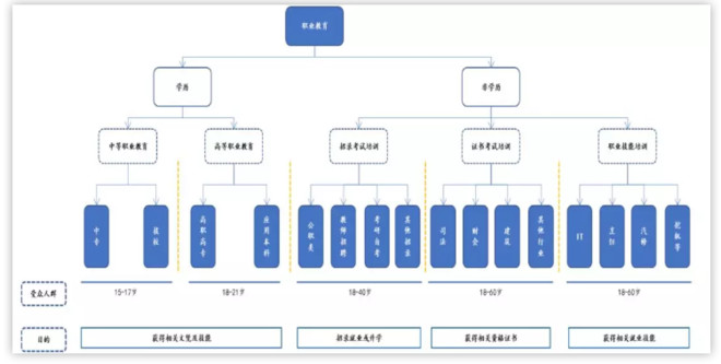 根据教育部定义,中国职业教育体系一般分为学历及非学历职业教育,两者区别,字眼上已经一目了然。其中,非学历职业教育主要包括职业技能教育和职业考试培训,学历职业教育包括职业中专教育及高等职业教育。非学历职业教育的受众更加广泛,年龄从15岁至45岁,跨度达30岁,理论上有更多的需求及市场机会。东方教育的核心业务涵盖职业技能教育,同时,亦有部分学校提供小部分民办职业中专教育。