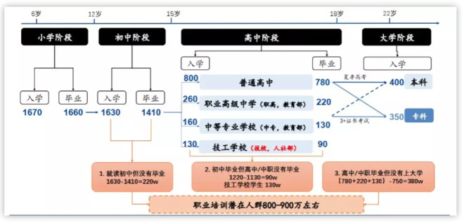 根据国盛证券的研究,我国升学路径筛选机制为职业培训提供充足的需求基础。经过层层考试筛选洗礼后,每年1600万入读初中的人群中,最终仅400万人进入本科和340万人进入专科院校接受高等教育,余下的 800-900 万均是每年进入职业培训市场的潜在需求人群。以东方教育为代表的职业培训机构,长期班面临的主要竞争对手是学历类职业教育学校,短期班主要竞争对手来自于非学历职业培训机构,主要生源为年龄15岁至21岁学生。