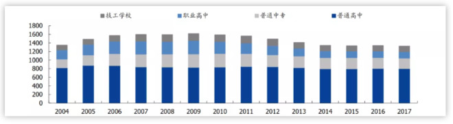 其次,根据2004-2017年招生情况,普通高中招生比例稳定在60.5%左右。简言之,因为教育的筛选属性,总有一定比例的人群需要接受职业教育。