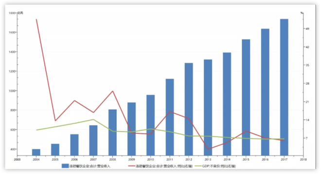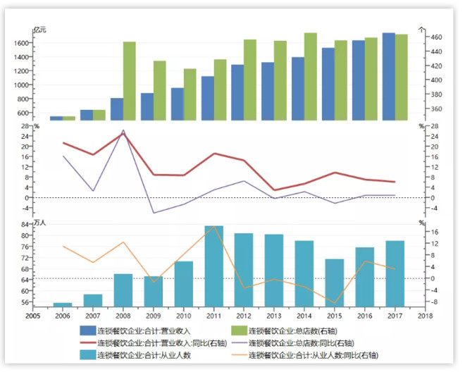 另一方面,连锁企业的发展更具韧性,行业过往多年的营收增速基本都是高于或同步GDP增速。不过,资本的逐利性在连锁餐饮业体现得更加极致,2012年至今连锁企业的开店数基本持平,营收的驱动力主要来源于单店营收增速。而从业人员数量的变动幅度则略大,2015年的相对低位较2011年的高位跌幅超过13%。但考虑到整个餐饮业1800万(2016年)的从业人员,连锁企业从业人数数量的变化并不会对整个餐饮业产生冲击。