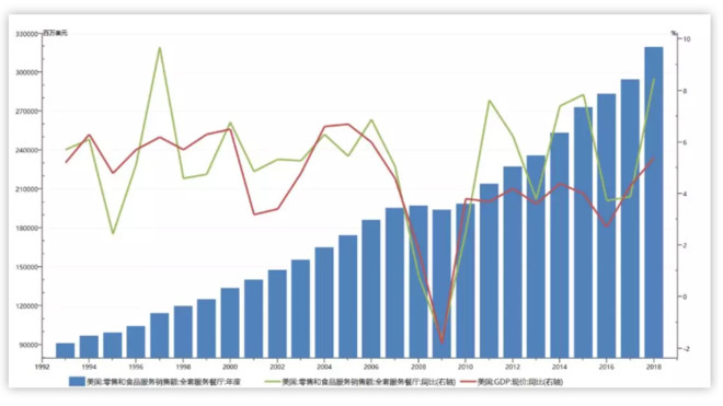 参考美国全服务餐饮行业的发展,我们同样可以发现,即使城镇化程度足够高,但只要岁月静好,限额以上餐饮业的发展基本都是维持平稳增长的态势,基本跟GDP增速同步,甚至在2008年至今的这轮复苏周期中成为大beta。整体看,餐饮业始终是一条足够稳定的赛道。