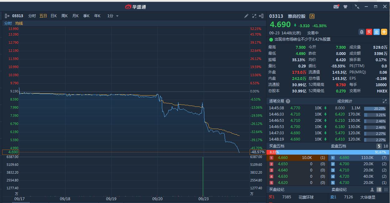 格隆汇9月23日丨雅高控股(3313.HK)继上交易日下跌11.11%后,于今日盘中出现两次直线下跌,现报4.69港元,跌幅41.38%,两连跌近50%;暂成交3396万港元,最新总市值145.3亿港元。