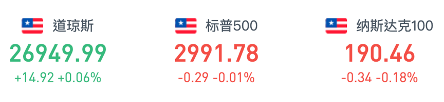 美股周一收盘基本持平,三大股指涨跌不一。其中,道指涨0.06%,标普500跌0.01%,纳斯达克100跌0.18%。