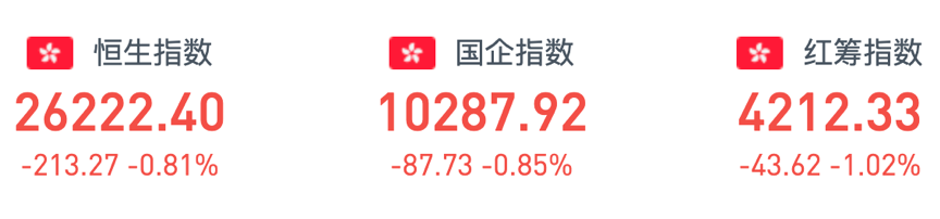 周一,恒生指数跌0.81%,收报26222.40点,全日成交额达652.88亿港元;国企指数跌0.85%,收报10287.92点;红筹指数跌1.02%,收报4212.33点。